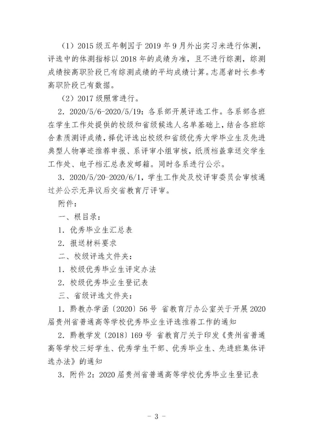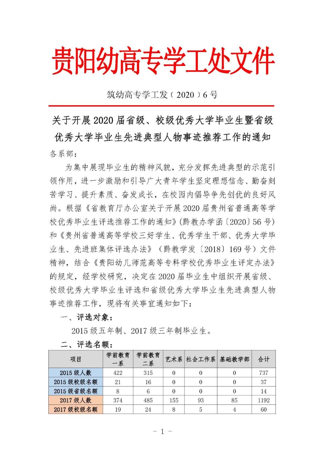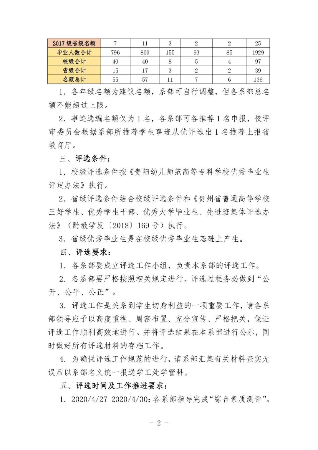 为集中展现毕业生的精神风貌,充分发挥先进典型的示范引领作用,进一步激励和引导广大青年学生坚定理想信念、勤奋刻苦学习、提升素质、奋发成长,在校园内倡导争先创优的良好风尚。根据贵州省教育厅文件精神,并结合《贵阳幼儿师范高等专科学校优秀毕业生评定办法》的规定,经学校研究,决定在2020届毕业生中组织开展省级、校级优秀大学毕业生评选和省级优秀大学毕业生先进典型人物事迹推荐工作,现将有关事项知如下: