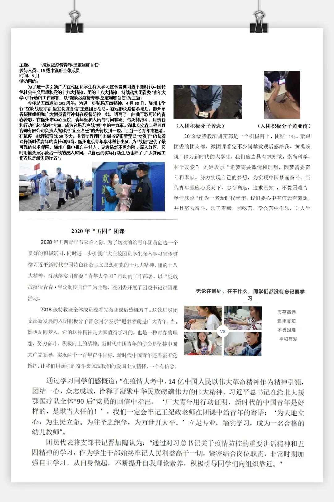 青年是整个社会力量最积极、最有生机的也是国家和民族的希望。新时代的我们应该缅怀过去学习五四青年精神。1919年的五四运动中,青年学生充当主力军,用自己的青春和生命来为正义和真理而战,最终取得胜利。他们在用他们自己的方式来体现青年的担当,这种不畏强暴和黑暗的精神值得我们学习。本次线上团课主讲人分别为学前与早期教育系团委陆诚志老师、学前与特殊教育系团委王纪政老师、基础教学部团委陈婷老师、艺术系团委唐荣敏老师和社会工作系团总支吴学丹老师。团委书记们通过历史事件、五四精神、抗疫故事等事例,运用青年学生乐于易于接受的讲解方式,将自身学习心得融入团课,传递正能量,激发团员争做新时代好青年的精神风貌。