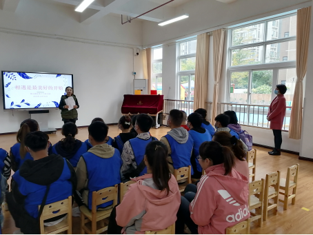上午9点20分,在幼儿园多媒体教室,谢俊毓园长主持召开了本次见习生见面会。首先,谢园长向大家介绍了幼儿园办园时间、班级和教职工人数等情况。其次,谢园长对大家本次实习提出学习要求和实习注意事项。最后,由幼儿园张老师根据本次见习的主要任务跟大家详细介绍本次实习具体安排,然后张老师请每个班带教老师和同学们见面认识,并进行了见习分班分组,将17名见习生,分配到了6个班级,包含了小、中、大班三个年龄段。同学们正式开始了为期两周的幼儿园见习工作。