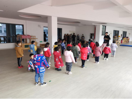 照片二:课程组、幼儿园教师们观摩唐丁同学组织的体育活动