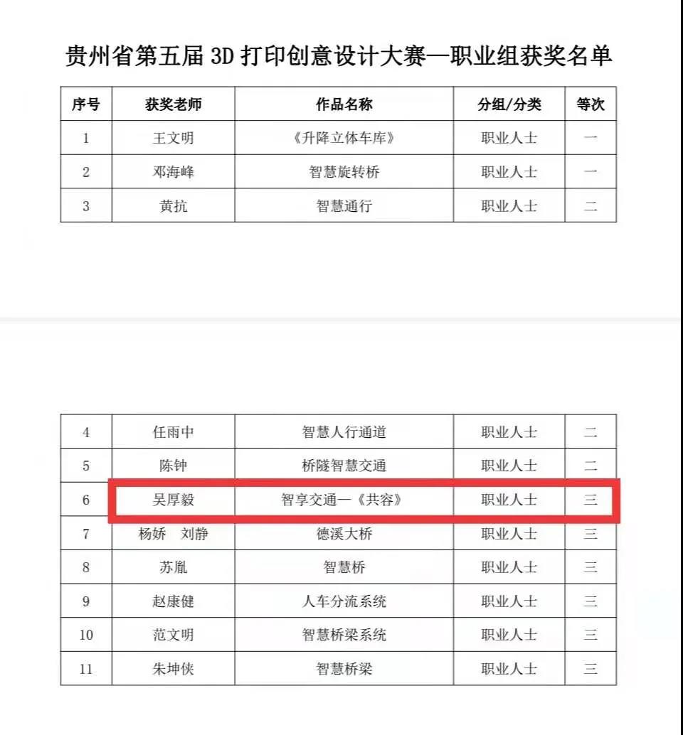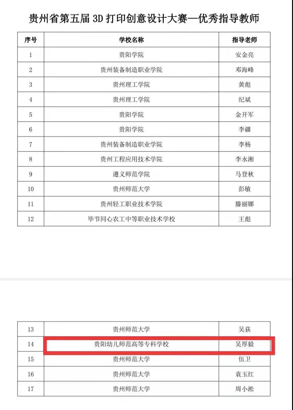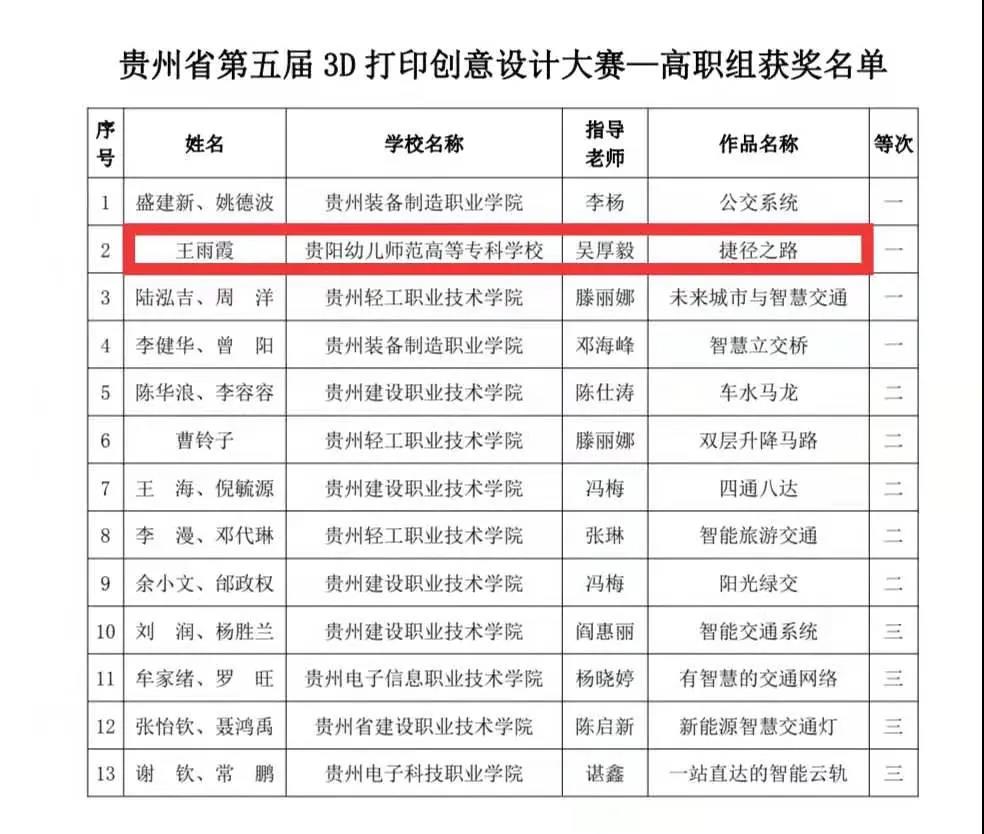 在刚刚评选的贵州省第五届3D打印设计大赛中,我校学生王雨霞获高职组一等奖,吴厚毅老师获优秀指导老师奖,同时吴厚毅老师还获职业组个人三等奖。特此喜报,以表祝贺!