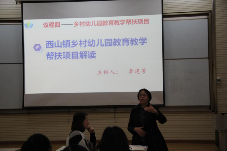 第三议程为“乡镇幼儿园帮扶项目”,主讲人李晓芳老师对专任教师参与度和有效帮扶上提出了相应要求。