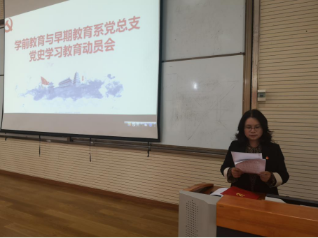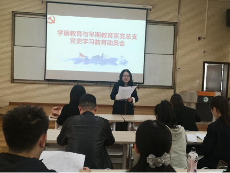 2021年4月6日14点,学前教育与早期教育系党总支全体党员在时光校区学前合班教室(三)开展2021年党史学习教育动员会,会议由学前教育与早期教育系党总支张远梅副书记主持。