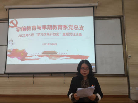 根据校党委的统一安排部署,2021年5月6日下午两点,学前教育与早期教育系党总支在总支副书记张远梅同志的组织带领下,在时光校区学前合班教室(三)集中学习和重温新中国改革开放伟大进程和重大历史意义。党总支全体教师党员和部分学生党员代表参加此次主题党日活动。