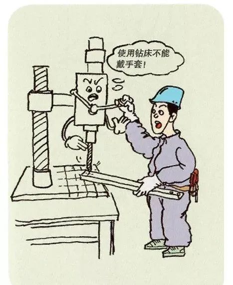 使用钻床等旋转机具时戴手套等