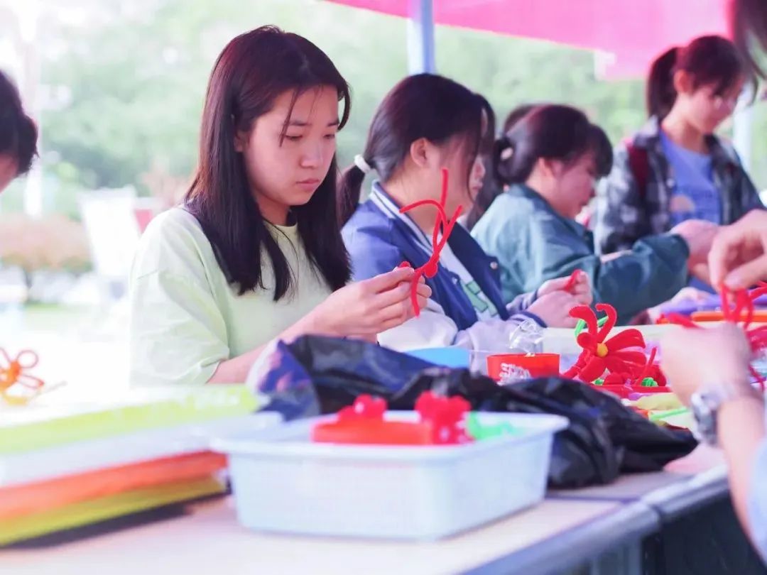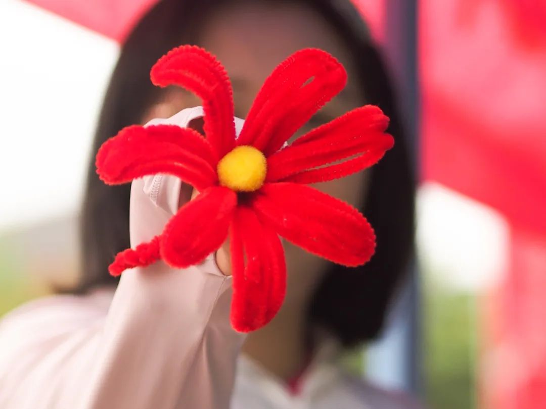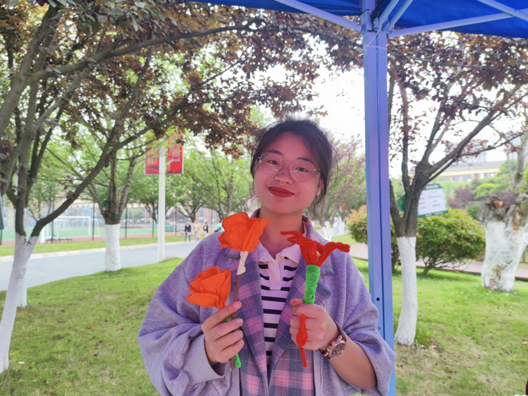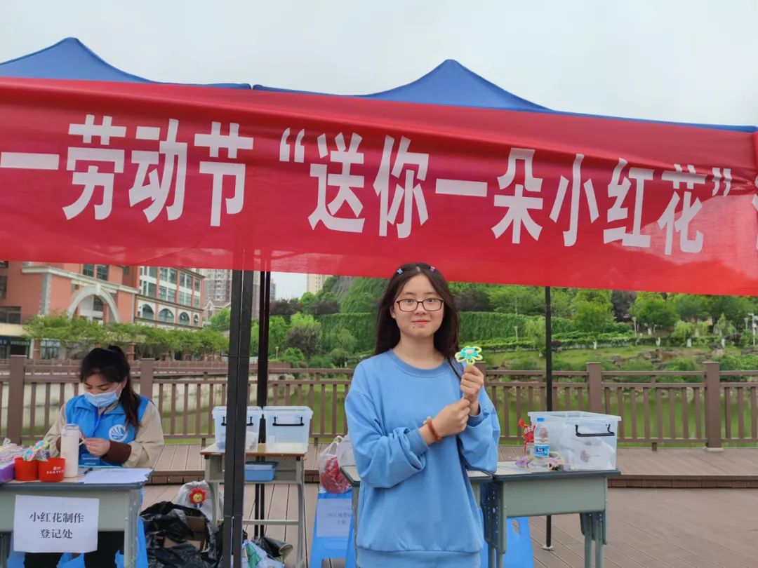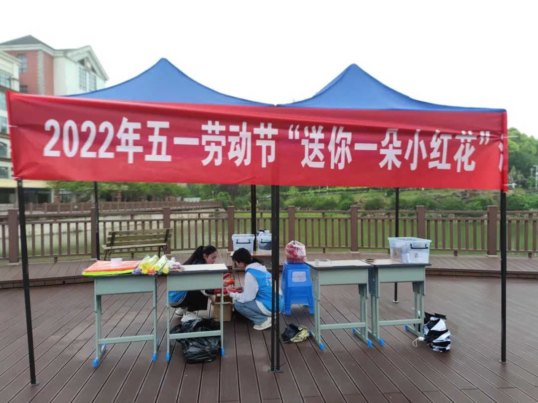 4月29日,我们在曰生湖旁举办了“送你一朵小红花”活动,邀请同学们手工制作小红花送给心中最美劳动者。