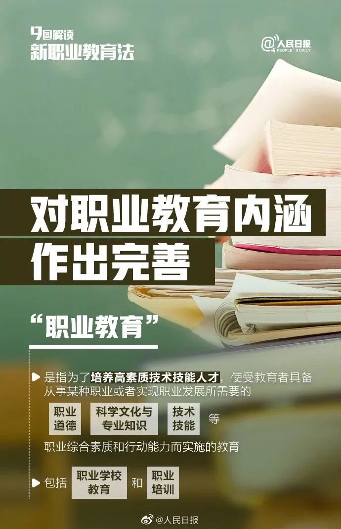 新职业教育法:明确职业教育是与普通教育具有同等重要地位的教育类型,着力提升职业教育认可度,深化产教融合、校企合作,完善职业教育保障制度和措施,更好推动职业教育高质量发展。