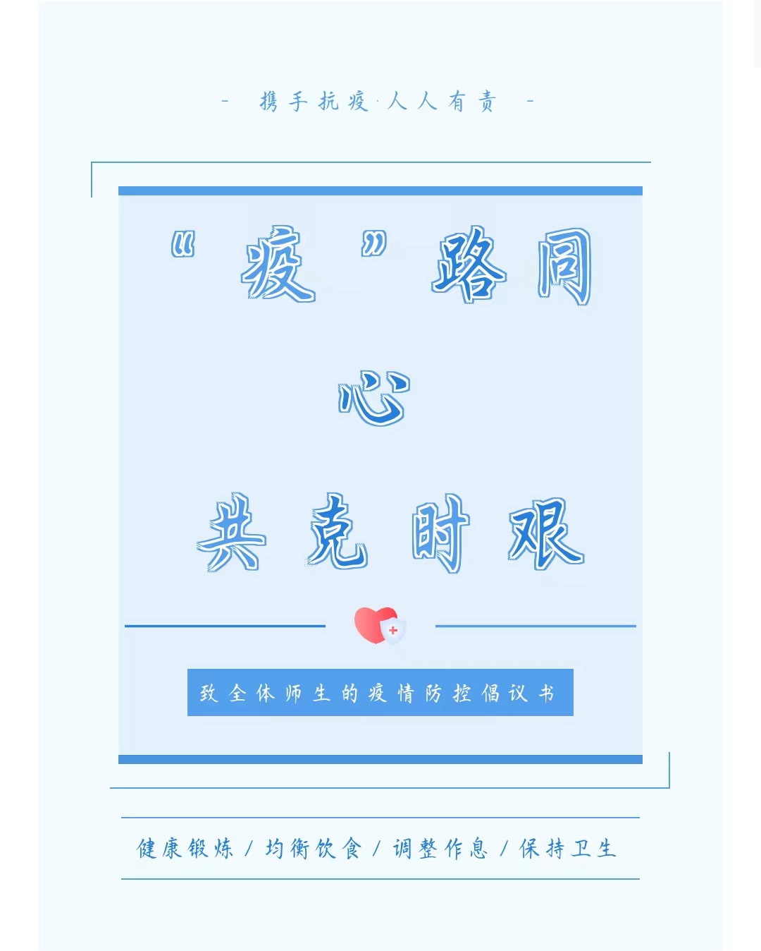 亲爱的老师们、同学们,校园是我们共同的家园,需要每一个人贡献力量、共同守护。让我们一起行动起来,坚定信心、守望相助,坚持科学防控、人人有责,同心协力打赢这场疫情防控的阻击战!