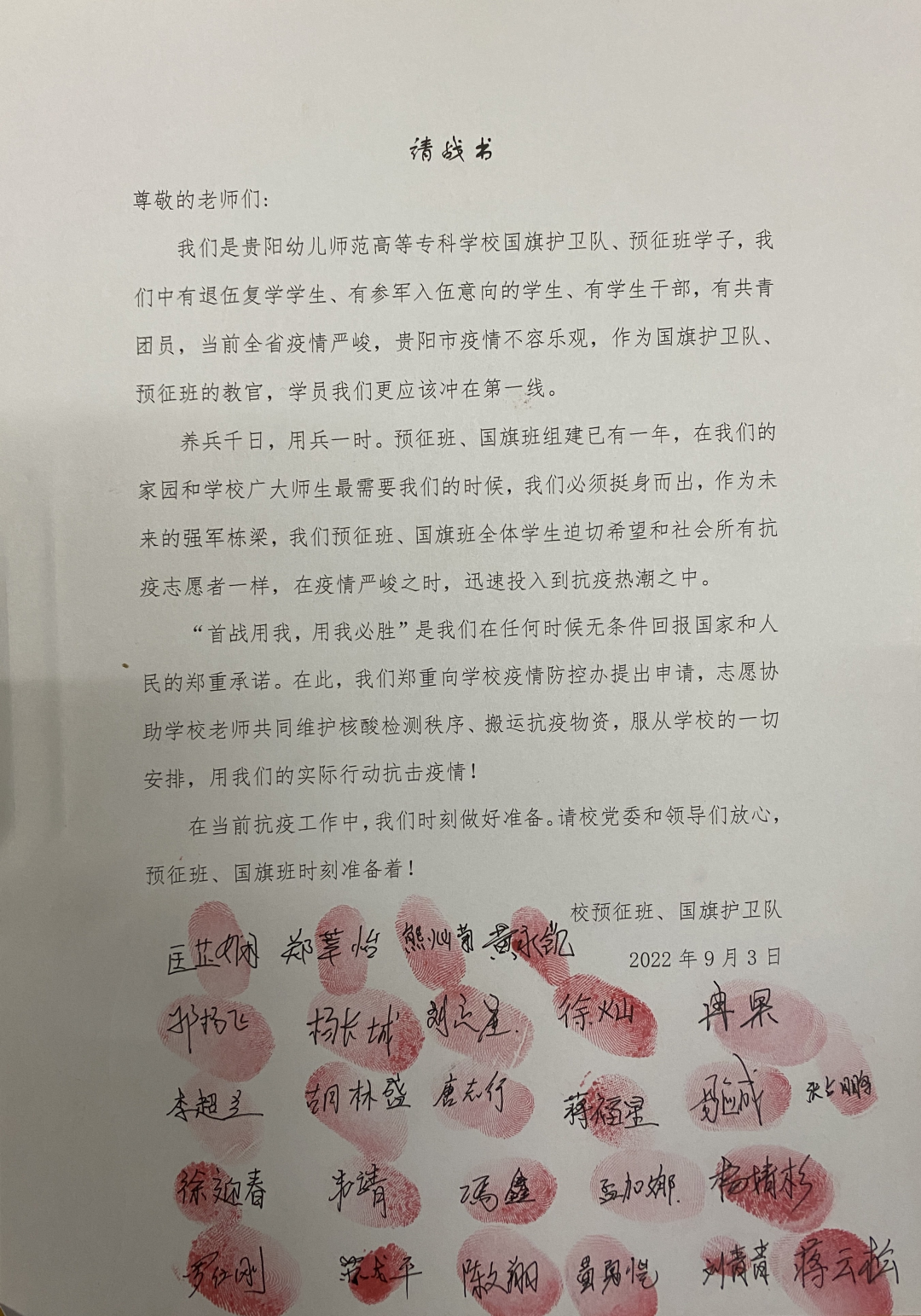 “当前全省疫情形势严峻,贵阳市疫情不容乐观,作为退伍学生、学校预征班教官,我们应当冲锋在前!首战用我,用我必胜,捍卫校园,抗击疫情!”“预征班”教官陈文翔如是说。